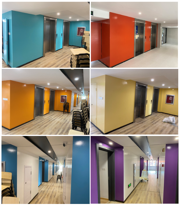 學校位于浙江省寧波市,由于南方氣候濕潤,學校宿舍內墻受潮逐漸出現粉化剝落現象,存在安全隱患,影響使用安全及美觀。項目于2021年進行翻新改造,要求裝飾材料綠色環(huán)保、持久耐用,便于維護,采用七彩內墻,與其多元化的教學理念完美契合。