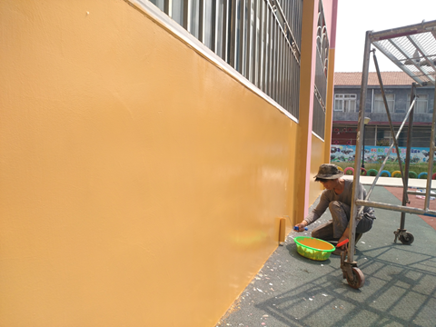 即墨市靈山鎮(zhèn)中心幼兒園位于山東省即墨市靈山鎮(zhèn)衛(wèi)東村,是一所公辦幼兒園。幼兒園原有墻體采用傳統(tǒng)有機(jī)涂料涂刷。有機(jī)涂料的耐候性、耐鹽霧性較差、有機(jī)色漿陽(yáng)光照射后易褪色,經(jīng)過(guò)一段時(shí)間使用后,原外墻涂料出現(xiàn)了褪色、開(kāi)裂、起皮和脫落的現(xiàn)象。幼兒園原內(nèi)墻涂料由于不耐擦洗,經(jīng)過(guò)一段時(shí)間的使用后出現(xiàn)了很多臟污和涂鴉痕跡。